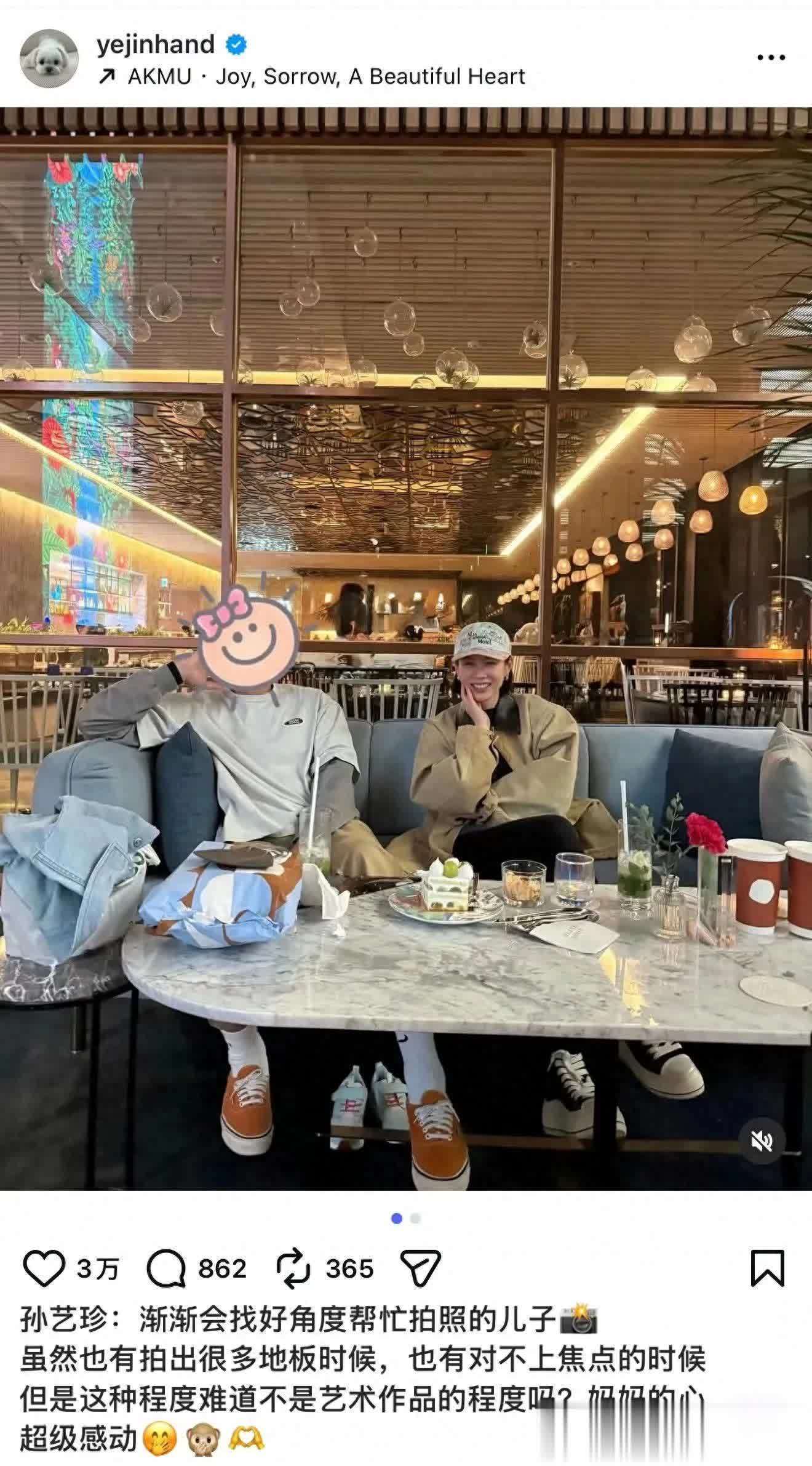 但为了考虑到玄彬唯粉,所以每次孙艺珍晒与玄彬合影的时候,都会给打上贴纸,上次甜豆给拍合照的时候,也是同样打上了可爱的贴纸,不得不说,孙艺珍真的太低调了。