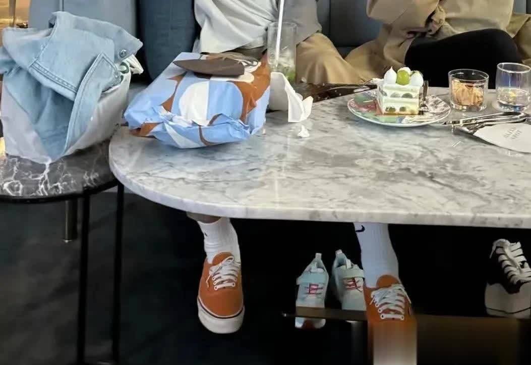 孙艺珍穿着卡其色的工装外套,搭配黑色裤子,玄彬白色上衣搭配卡其色的休闲裤,脚踩橙色帆布鞋,玄彬脚跟前还有一双儿子的小鞋子,看来甜豆为了拍照,都是光着脚的呢。